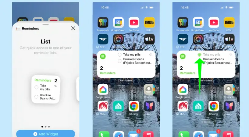提醒小工具有三種不同尺寸,列出即將完成的待辦事項。更棒的是,每個任務旁邊都有一個小圓圈可以點擊;一旦完成,該任務就會從小工具中消失,確認你已經完成任務,且不必進入提醒事項。