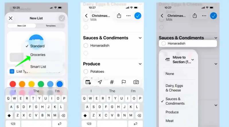 只要建立一個新清單,選擇「雜貨」作為清單類型即可。然後輸入你需要購買的物品,提醒事項會幫你整理。如果提醒事項錯檔,將該項目移到清單的正確位置很容易。
